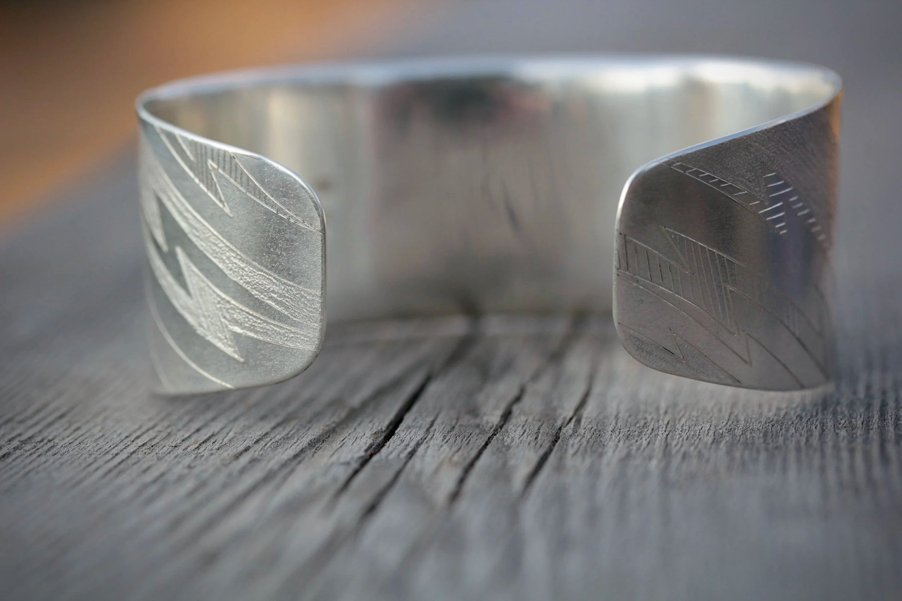 This magnificent sterling silver wide cuff is a dynamic piece of wearable art, exuding strength and elemental energy. The surface is meticulously finished with a satin polish, which provides a soft, luminous sheen that highlights its sculptural form. Cutting across the substantial 1-inch wide band is a dramatic, hand-tooled lightning bolt design, deeply etched and oxidized to create a striking contrast against the polished silver. This bold motif gives the cuff a raw, powerful energy, evoking the force and beauty of a storm. The piece is a modern interpretation of a classic design, perfect for those who appreciate robust craftsmanship and a strong visual statement.