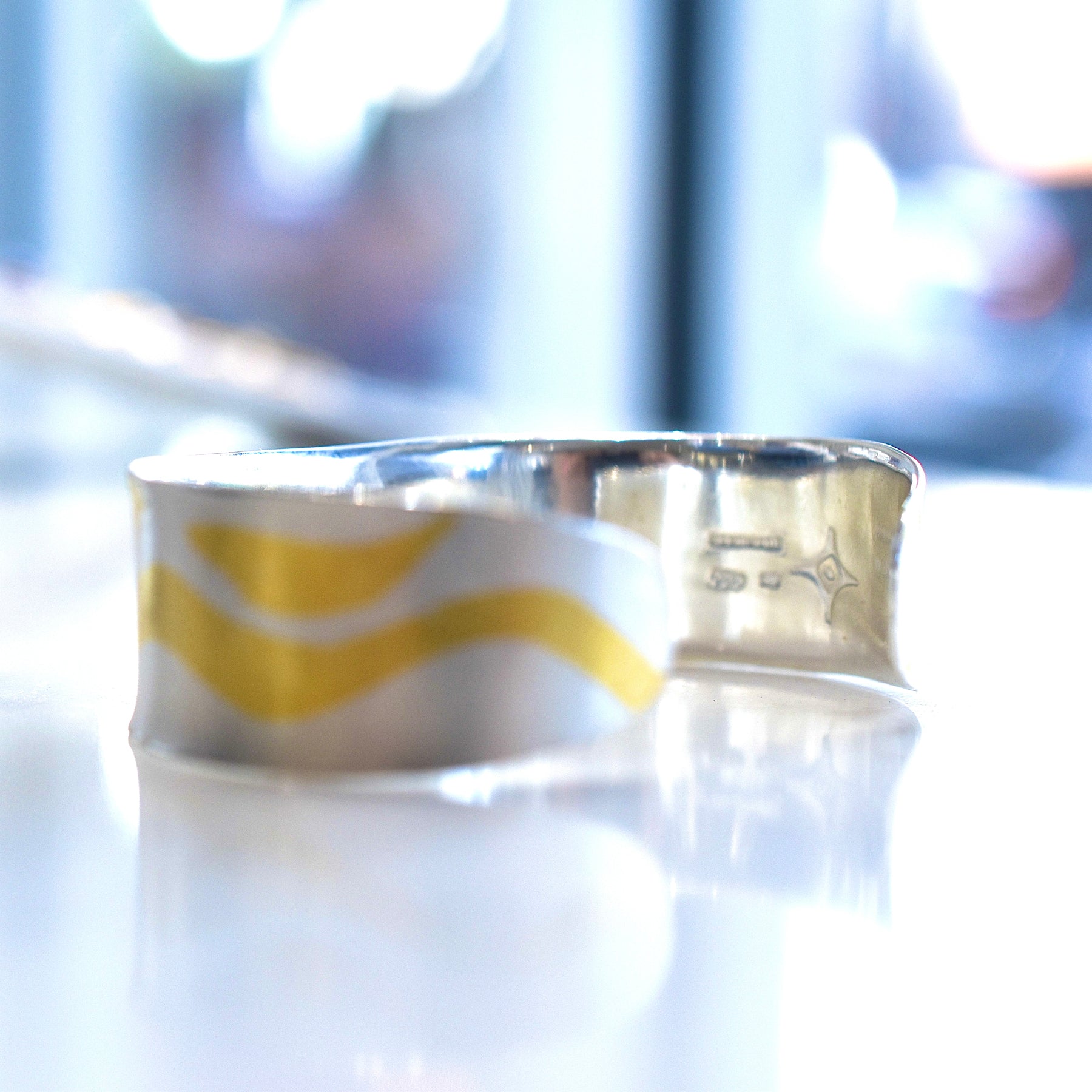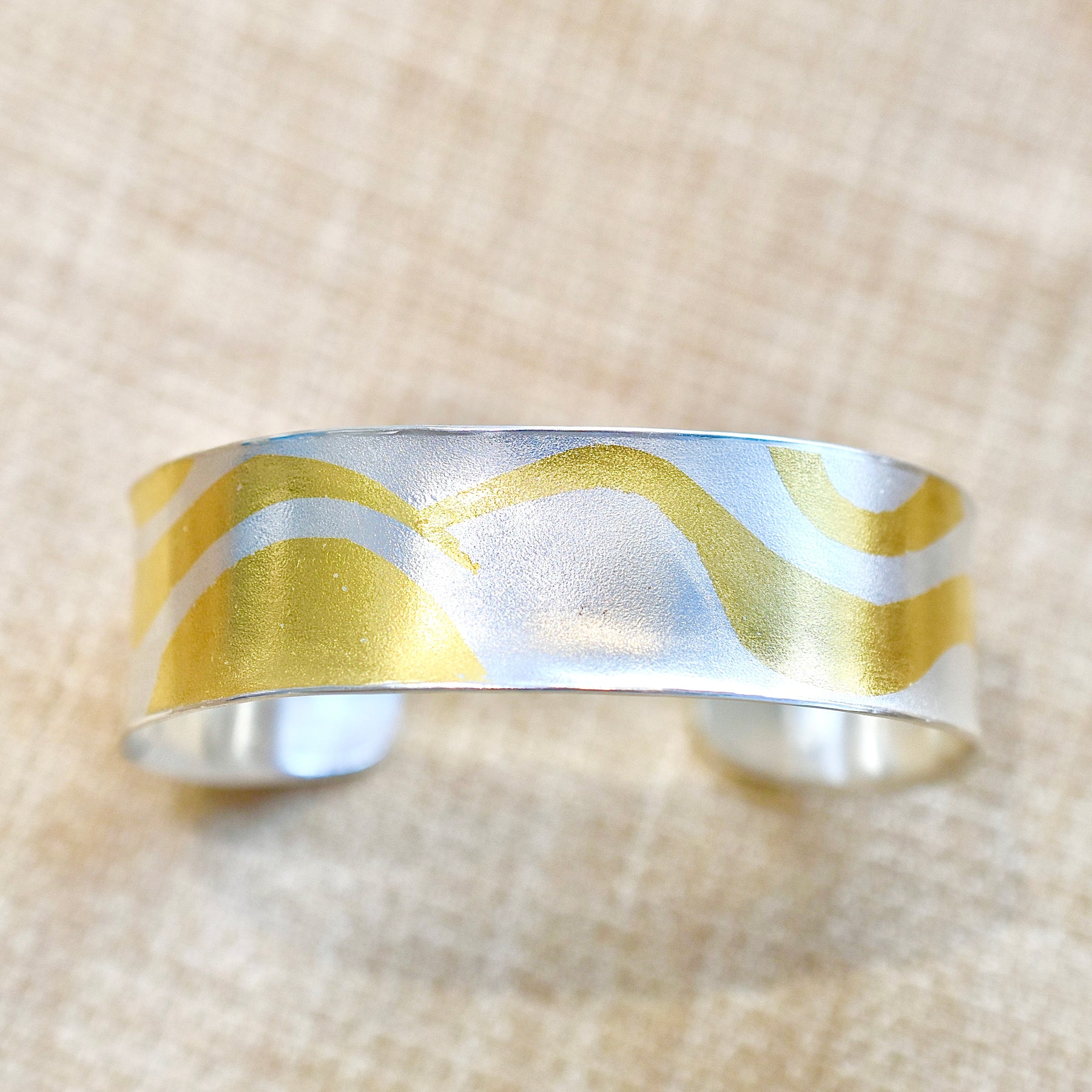 This exquisite cuff bracelet is a dynamic piece of wearable art, designed to gracefully adorn a small-medium sized wrist. Crafted from Fine .999$ Sterling Silver, its exterior boasts a serene satin finish that provides a luminous, diffused glow. Flowing across this surface is a captivating Keum-Boo appliqué design of 23.5K gold fused shapes, resembling intertwining vines or golden river currents. The rich, buttery interior of the cuff provides a high-polish finish, offering a luxurious tactile contrast to the subtle exterior. This 3/4 inch wide cuff is a testament to the artistry of Carrie Armstrong of Big Sur Goldsmiths, hand-made with love in Talent, Oregon.