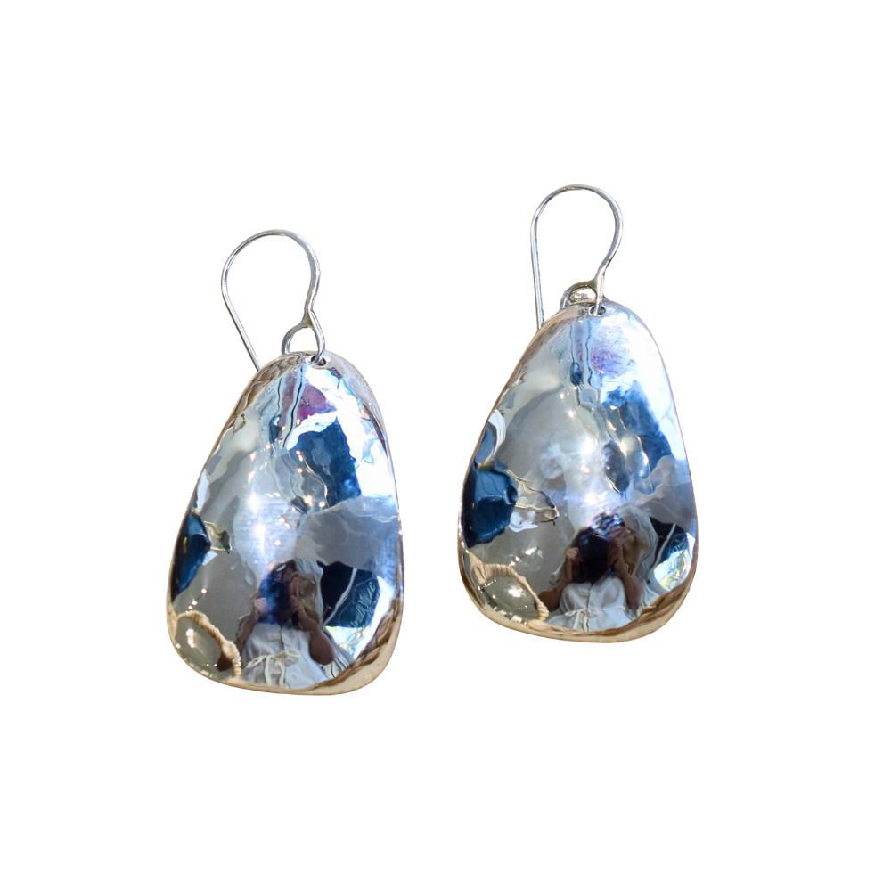 These exquisite sterling silver scoops are designed to capture and scatter light with dramatic effect. The main body of each earring is meticulously hand-hammered, creating an organic, rippling surface that feels both ancient and modern. Finished with an intense high polish, the metal acts like a liquid mirror, brilliantly reflecting every shift in light and color. They hang gracefully from hand-wrought ear wires, giving the scoops fluid movement and an artistic asymmetry. With a generous 2-inch total length and 1-inch width, these pieces are a bold, luminous statement, handmade by Carrie Armstrong of Big Sur Goldsmiths.