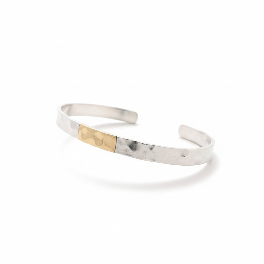 This exquisite Brewster Flats Bracelet is a signature cuff, handcrafted on Cape Cod, that captures the texture and luminous horizon of the famous tidal flats. The bracelet is a classic cuff style, forged from cool Sterling silver that is expertly hammered to create a captivating, light-diffusing surface. This hammered texture subtly evokes the rippled sand left behind by the receding tide. The focal point is a 14K gold centerpiece, a smooth or slightly domed accent that provides a warm, contrasting gleam at the top of the cuff. The simplicity of the open cuff design makes this two-tone piece both bold and extremely comfortable for daily wear.