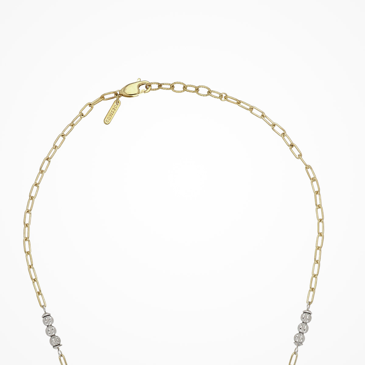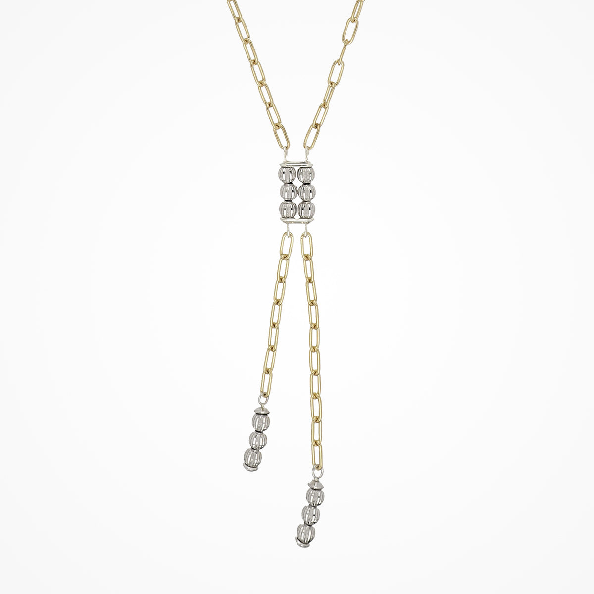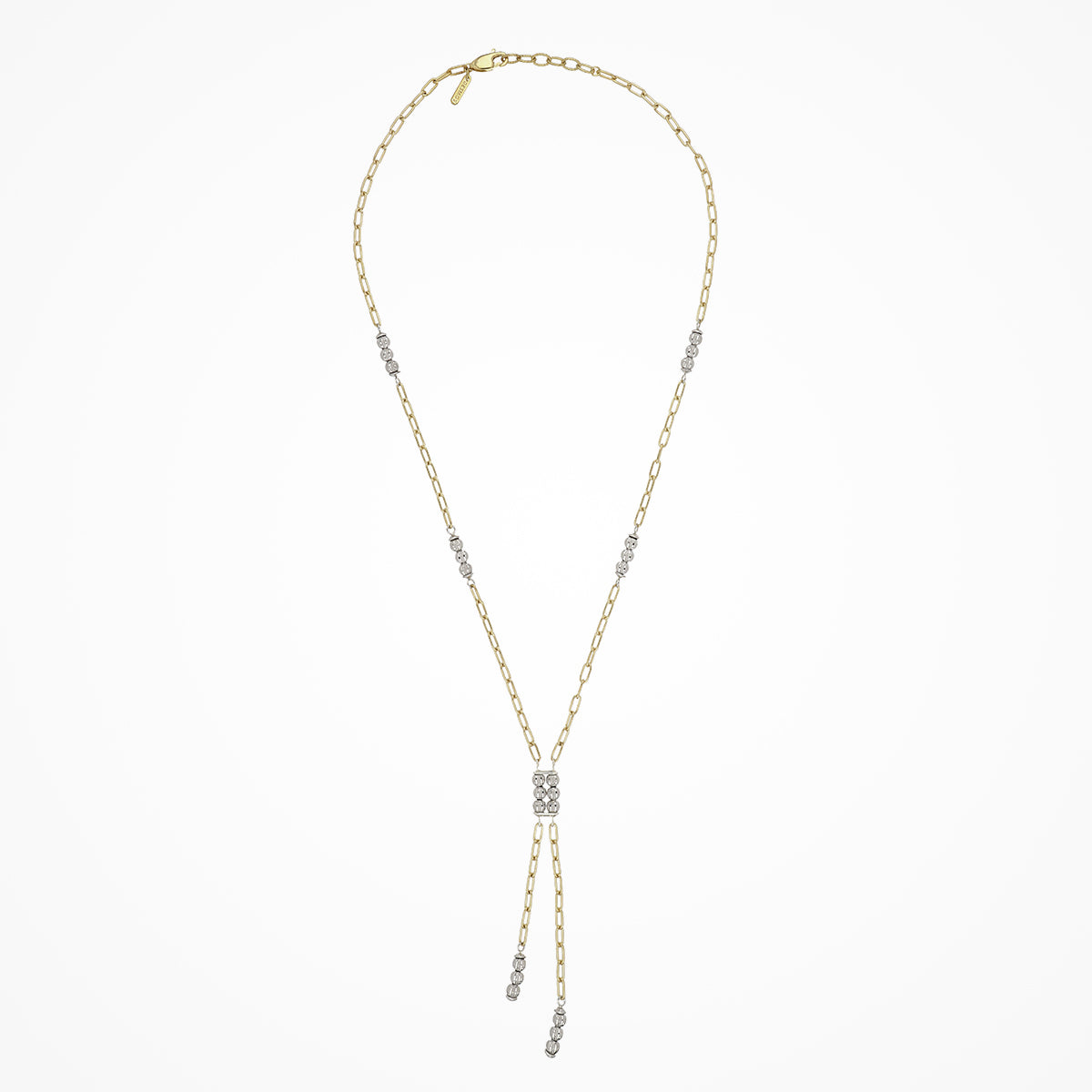 Sterling silver lariat necklace with alternating segments of yellow gold paperclip chain and white gold crystal ball beads.