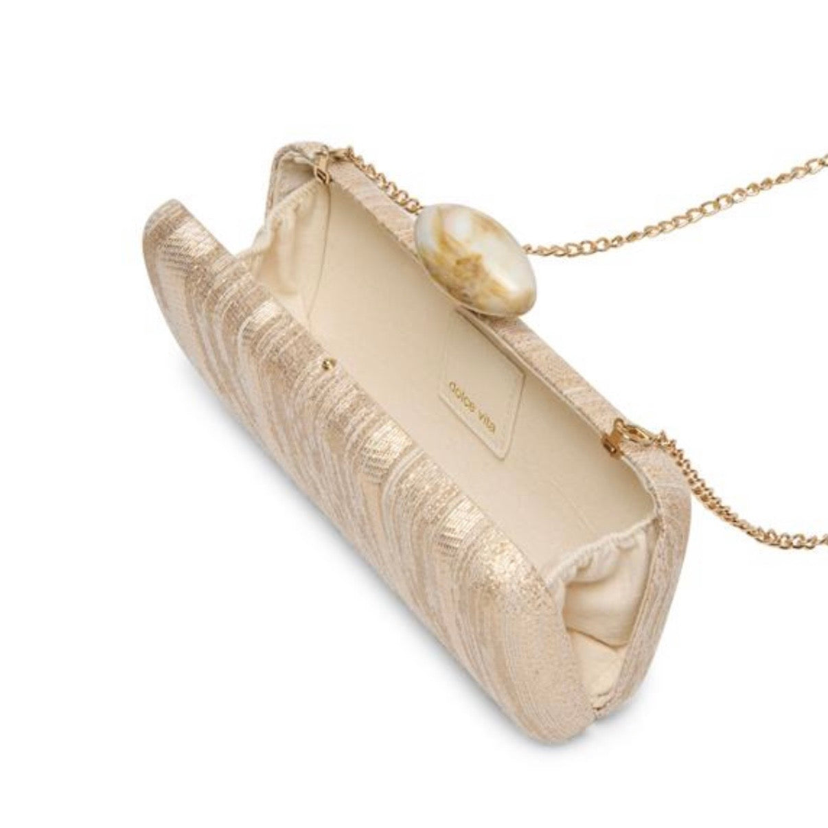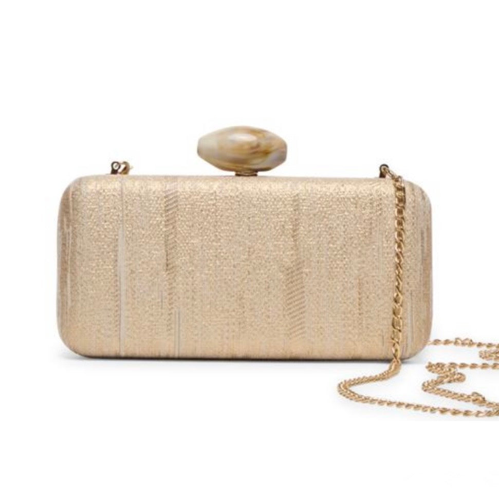 Hard box evening clutch in a gold infused natural fabric with an agate resin detail snap closure, gold hardware and removable chain.