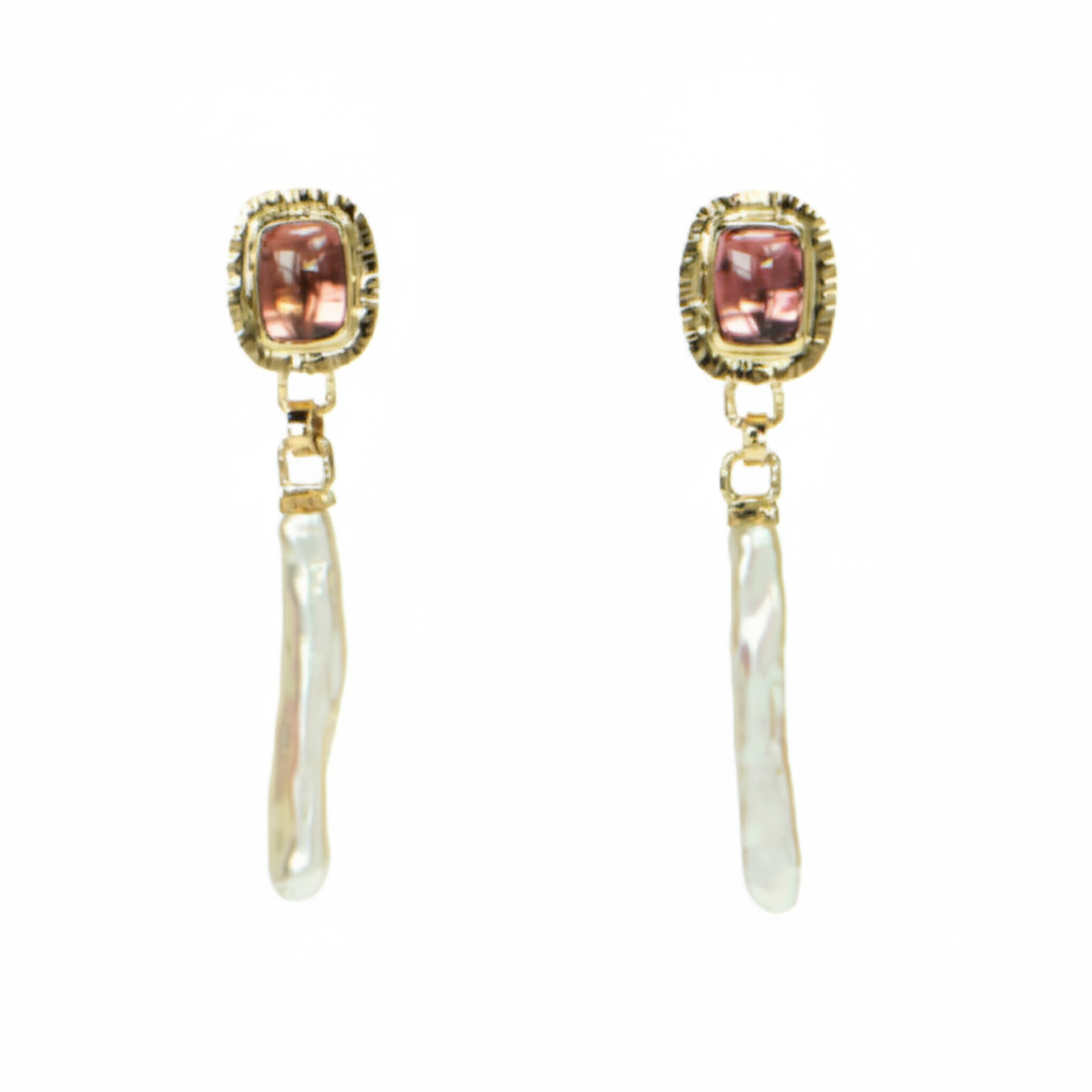 These earrings showcase a beautiful pairing of a Pink Tourmaline and a Freshwater Stick Pearl. Each earring features a smooth, cushion-cut pink tourmaline cabochon that reflects a gentle, rosy color. The tourmalines are securely set in 14k yellow gold with a unique hand-hammered texture on the bezel. Dangling below is an elongated Freshwater Stick Pearl, adding a unique, lustrous drop. These elegant earrings are perfect for adding a sophisticated, charming look to any outfit.