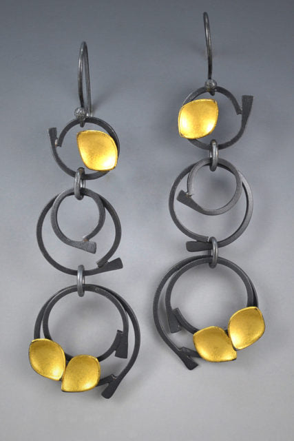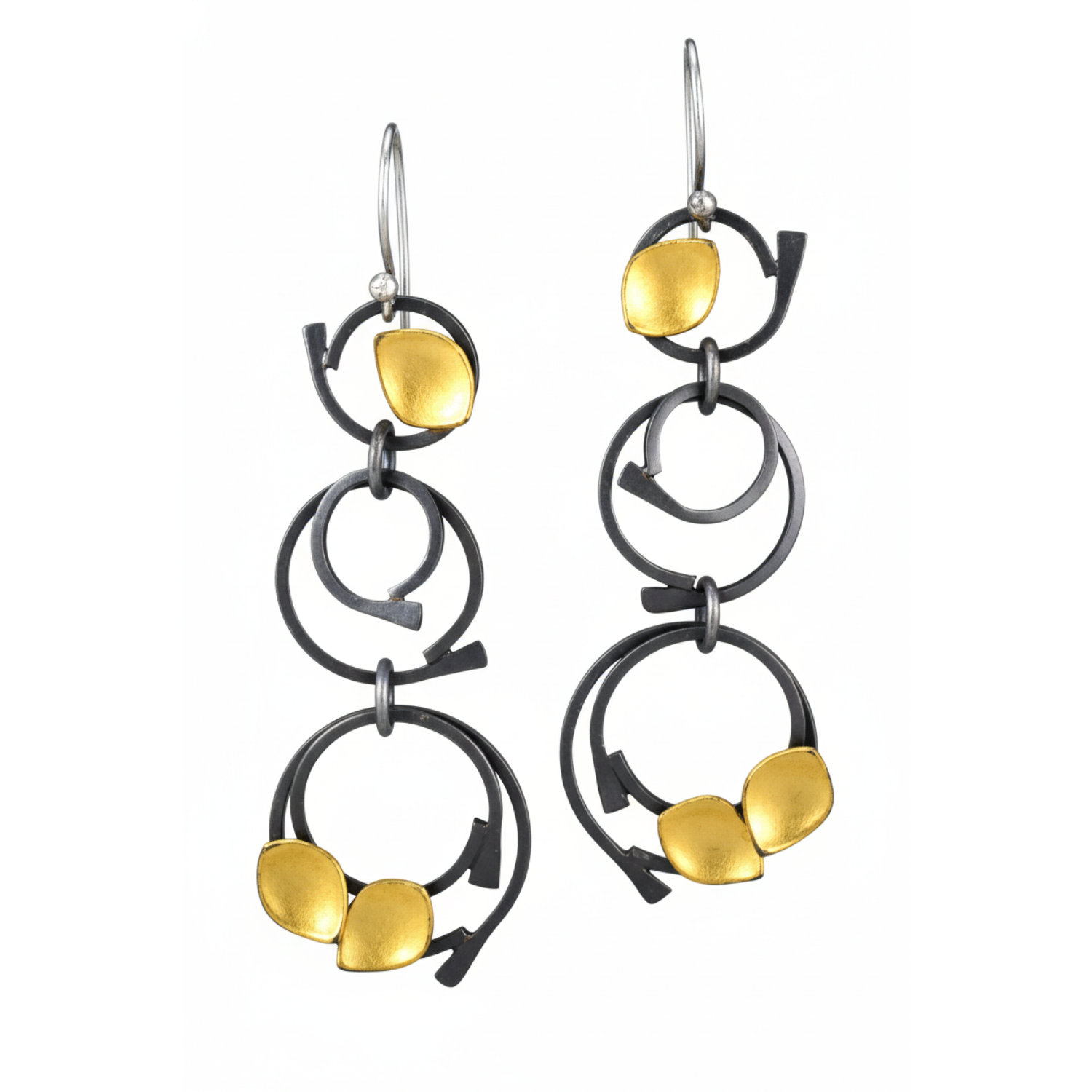 These extraordinary drop earrings combine abstract geometry with luminous organic accents. Each piece features a chain of two large, open rings crafted from deeply oxidized sterling silver, creating a sophisticated, matte-black structure. Attached to the dark rings are bold, convex leaf shapes entirely covered in brilliant 23K gold leaf, which seem to float and radiate warmth against the shadow. The interplay of the black metal framework and the vibrant golden forms gives the earrings a strong, contemporary, and dramatic presence. They are a statement piece, blending industrial chic with the preciousness of pure gold.