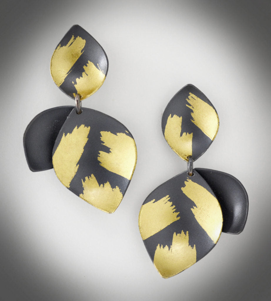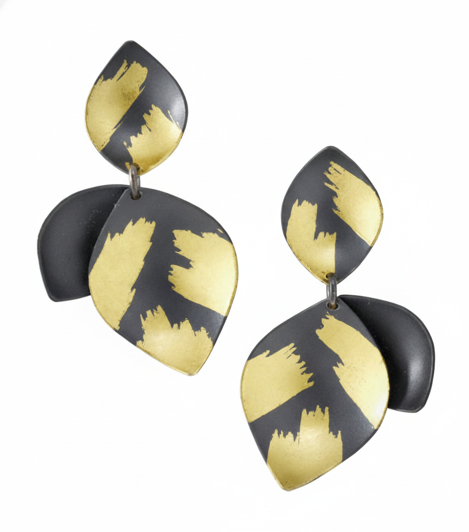 These dramatic drop earrings command attention with their bold use of color and texture. Each piece is composed of two overlapping, stylized leaf or petal shapes crafted from deeply oxidized sterling silver, creating a rich, matte-black surface. This dark backdrop is dramatically interrupted by fierce, spontaneous brushstrokes of luminous 23K gold leaf. The combination of the smooth black metal and the textured gold creates a striking, high-contrast effect reminiscent of primitive or tribal markings. Suspended freely from each other, the layered elements provide beautiful movement, making them an artistic and fiercely contemporary statement accessory.