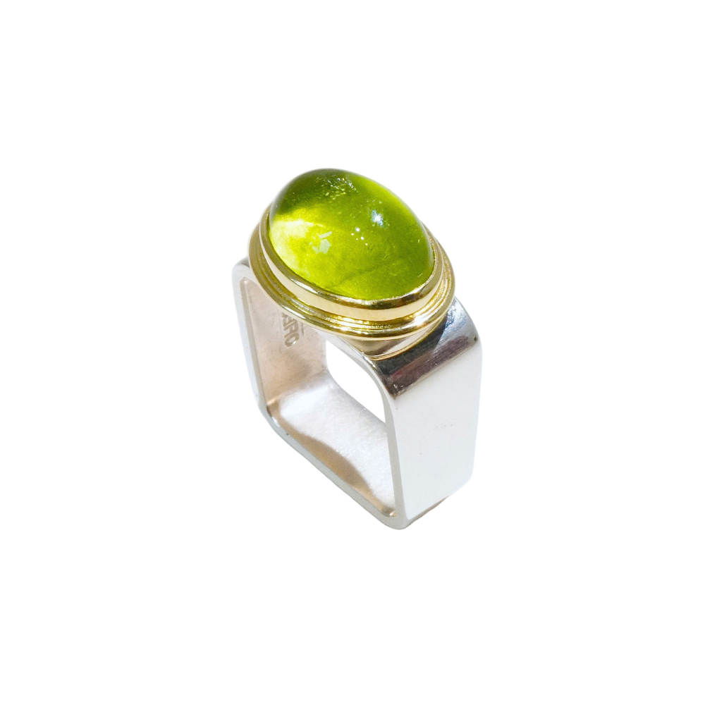 This ring captures the exhilarating energy of a sun-drenched garden with its vibrant design. Crowning the piece is a rich and luminous oval Peridot cabochon, whose intense, verdant green seems to glow from within. The dazzling peridot is embraced by a hand-formed 18k yellow gold bezel, creating a stunning visual contrast. This beautiful stone rests upon a strong, contemporary sterling silver square band that tapers for a comfortable fit. The design is a sophisticated balance of cool silver, warm gold, and the pure, lively color of peridot.