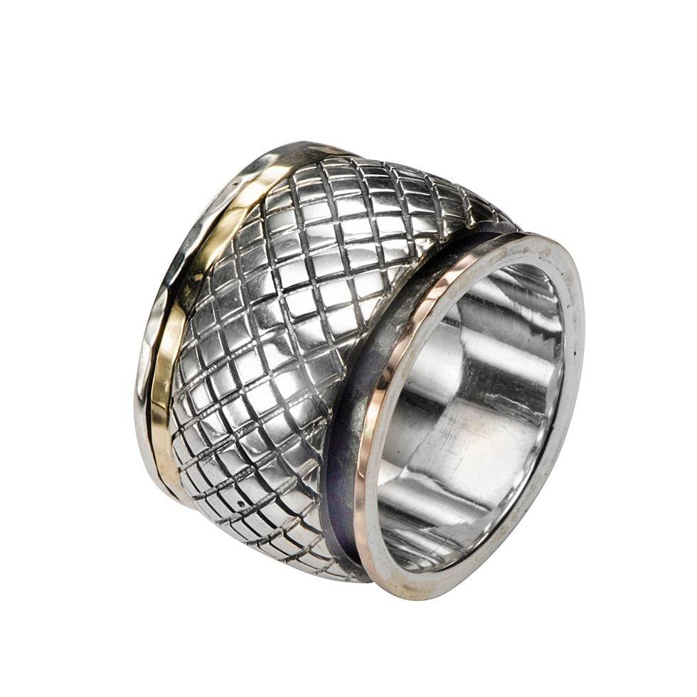 This commanding wide-band ring is an architectural study in tactile elegance and dynamic movement. The centerpiece is a broad, textured band of polished sterling silver intricately engraved with a dense, classic diamond-patterned mesh, reminiscent of antique chainmail. This substantial central element is designed to spin freely, providing a satisfying, kinetic counterpoint to the ring's solid structure. The design is framed by thinner, non-spinning borders, including a subtle band of warm 9k gold that adds a luxurious accent to the silver's cool brilliance. Bold and sophisticated, this ring is a captivating statement piece.