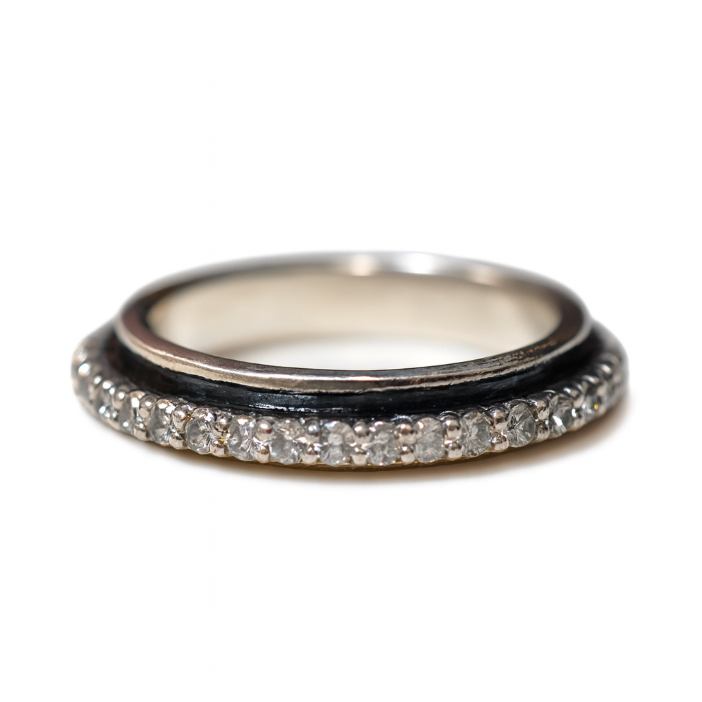 This slender and elegant ring presents a delicate yet captivating study in contrast and sparkle. Its central feature is a fine, polished row of shimmering cubic zirconia meticulously paved along the outer edge, creating a continuous band of radiant light. This luminous channel is set against a subtle, inner band of oxidized sterling silver, which deepens the color and accentuates the brilliance of the stones. The top and bottom edges are finished in bright sterling silver, completing the clean, refined look. This ring is a perfect, minimalist piece for everyday luxury, designed to catch the light with graceful movement.