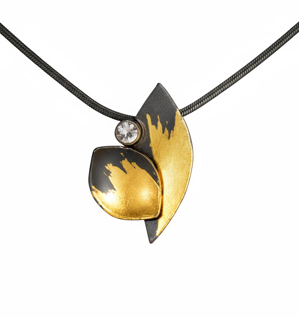 This artistic pendant is a striking composition of abstract, organic forms and high-contrast metals. The design features two overlapping, stylized leaves crafted from rich, deeply oxidized sterling silver for a luxurious matte-black finish. A sweeping section of one leaf is brilliantly covered in spontaneous strokes of 23K gold leaf, creating an intense, luminous focus against the shadow. Anchoring the juncture of the two elements is a single, sparkling White Sapphire, which adds a point of pure, cool light and brilliance. Suspended from a sleek black chain, this necklace offers a contemporary, museum-quality statement that beautifully balances the raw energy of gold with the sophisticated darkness of oxidized silver.