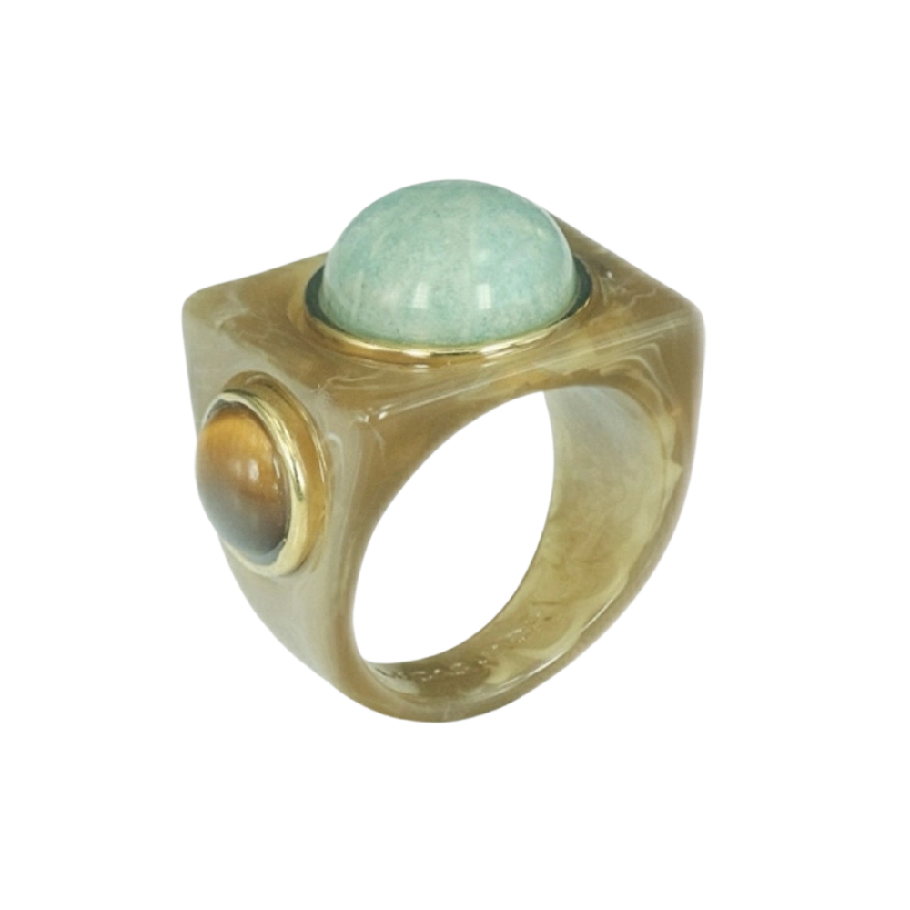 Swiss resin block ring with 18k gold plated brass bezels, round amazonite cabochon on top and round cabochon tigers eye side stones.