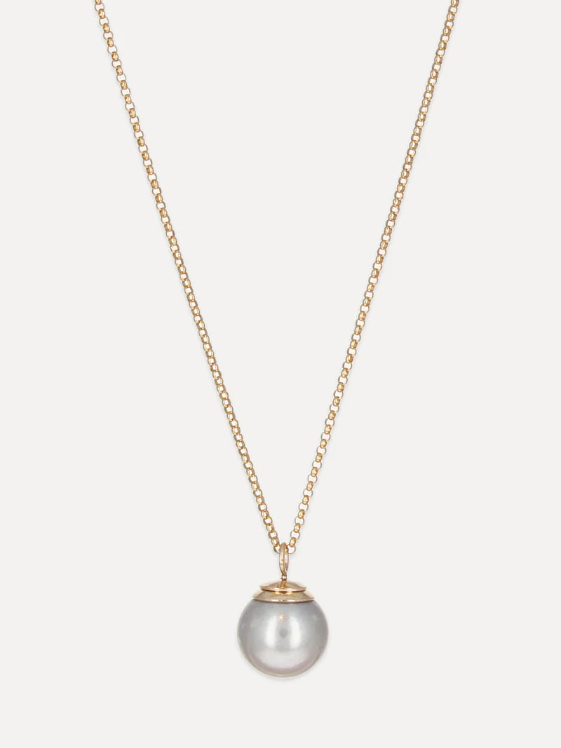Our Cleo Necklace reimagines the classic pearl drop with a modern touch. A smooth freshwater pearl with a soft silver undertone is topped with a hand-forged 14k gold-filled cap and floats freely from a delicate rolo chain. Understated and sculptural, this contemporary heirloom is made to be worn every day.