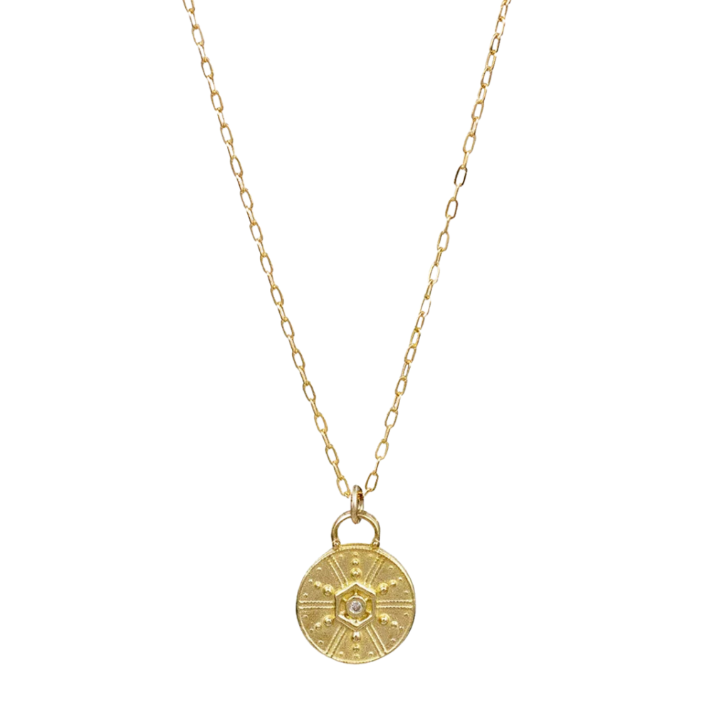 Inspired by the Tibetan Wheel of Life, our Raja Charm Necklace features a circular pattern with a stunning diamond at its center, symbolizing the ever-moving nature of time. Embrace the mantra "Explore New Possibilities" with this piece, reminding you that even when challenges arise, life's constant movement creates space for new opportunities. Wear it as a symbol of resilience and the endless potential for growth and change.