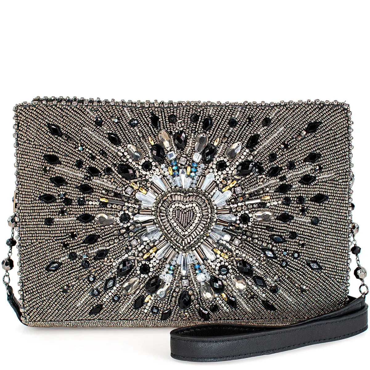 Make a statement and add some edge to your style with this must-have crossbody handbag featuring a center 3D heart bursting with sparkling gems and crystals. Perfect for standing out in a sea of ordinary.