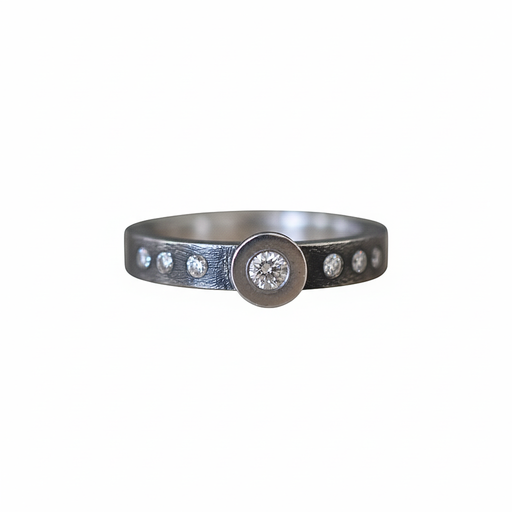 This ring is a powerful and intimate celebration of texture and contrast, blending a bohemian spirit with refined luxury. The foundation is a 3mm, heavily textured oxidized sterling silver band, lending the metal a matte, ancient appearance that evokes a hand-forged relic. Dominating the center is a dazzling brilliant white diamond, exquisitely set in a high polish sterling silver with 3 inlayed smaller diamonds on either side along the band, .25  tcw diamonds, creating a unique and deeply personal statement piece.