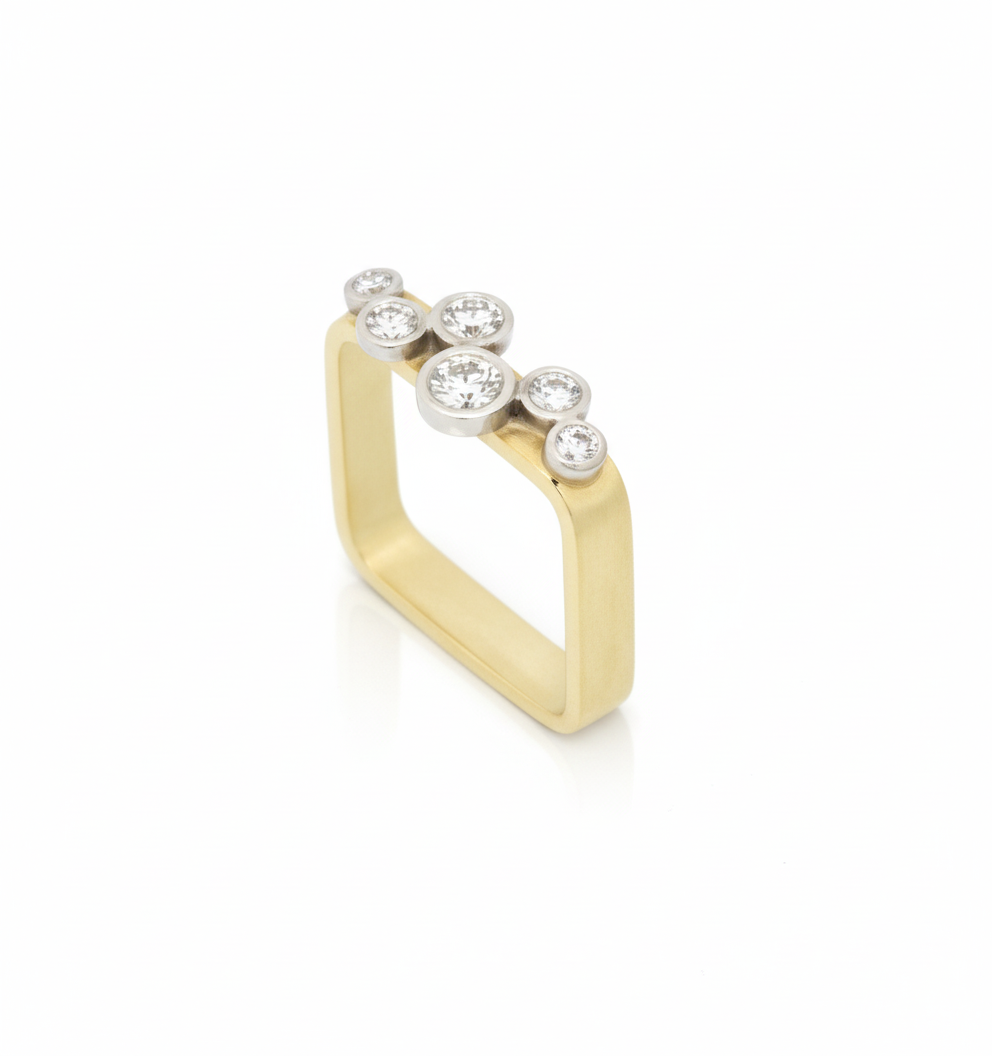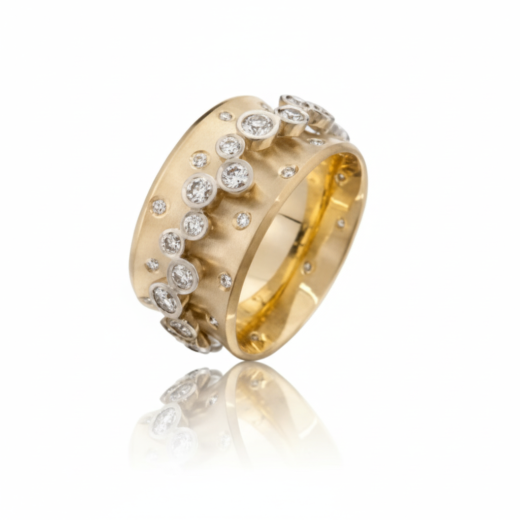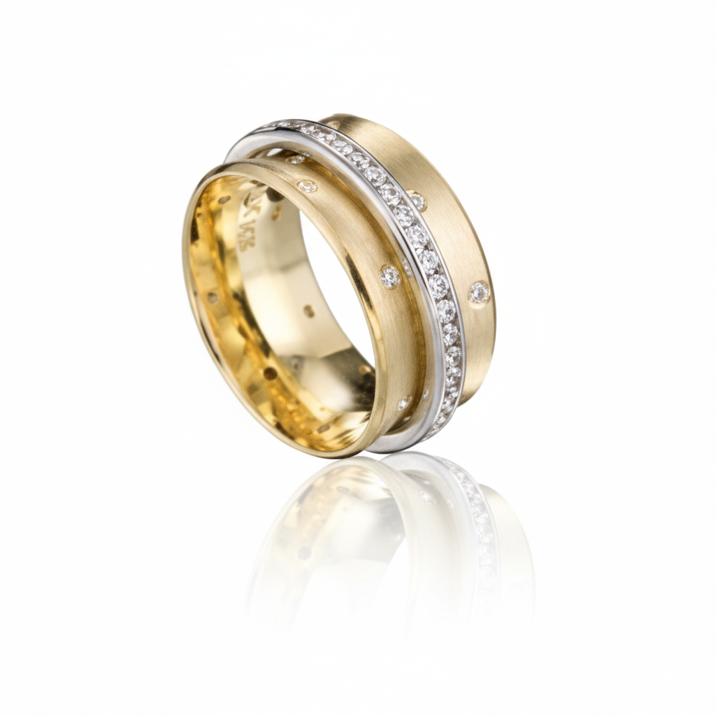 This collection is a celebration of vibrant color, contrasting textures, and sophisticated design. Each unique ring masterfully blends cool sterling silver bands with warm 14K and 22K gold bezels, creating a luxurious mixed-metal aesthetic.