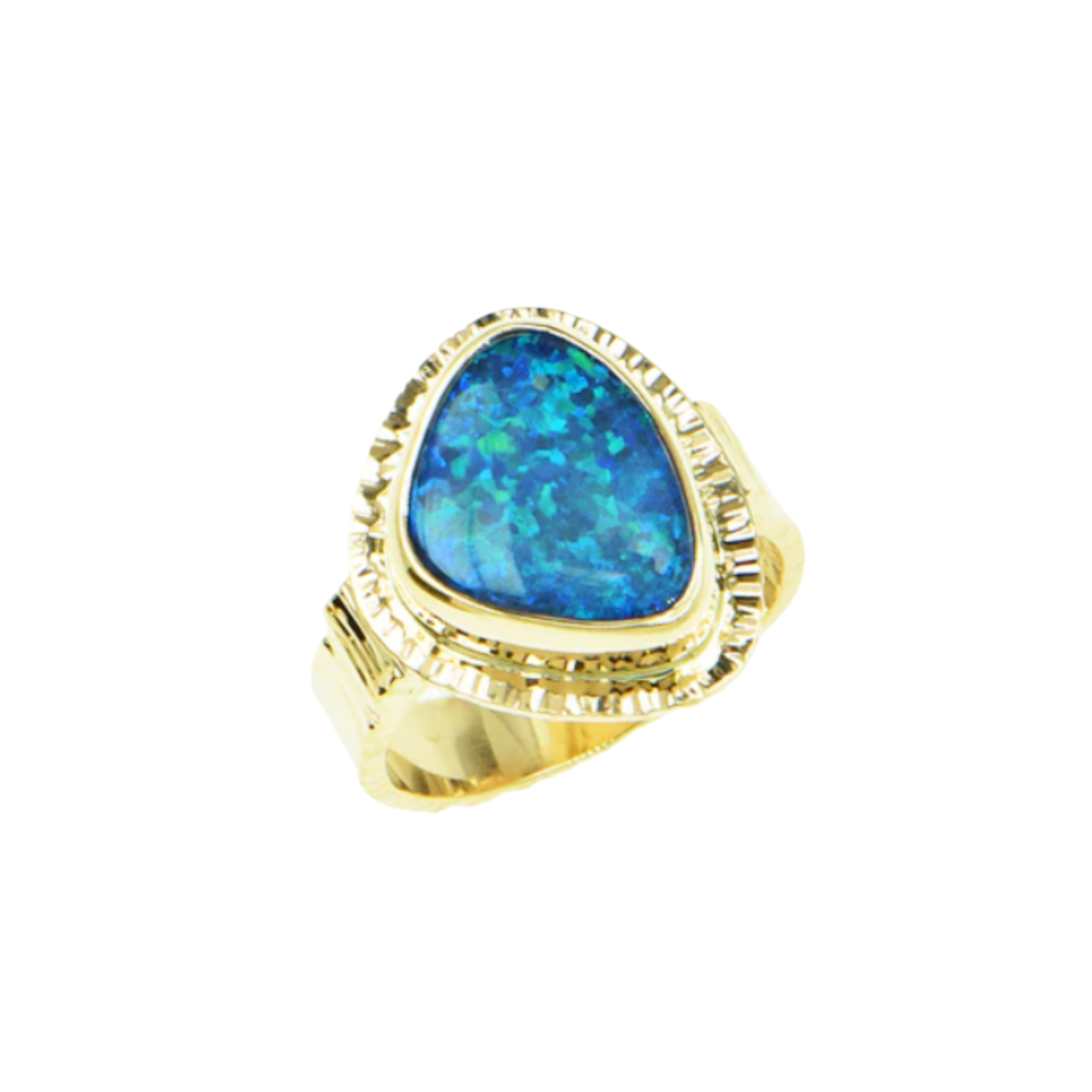 This bold ring captures a flash of the deep sea, making a powerful statement of nature's artistry. At its heart lies a magnificent 4.73 carat Black Opal Doublet, a chunky cabochon whose saturated blues and electric greens blaze with mesmerizing play-of-color. The radiant opal is held securely in a bold bezel setting atop a majestic 14K yellow gold band. This substantial $5 \text{ mm}$ band is fiercely alive, showcasing a forged and hammered texture on three sides. The resulting miniature treasure is a confident, sculptural piece, perfect for the wearer who embraces the wild.