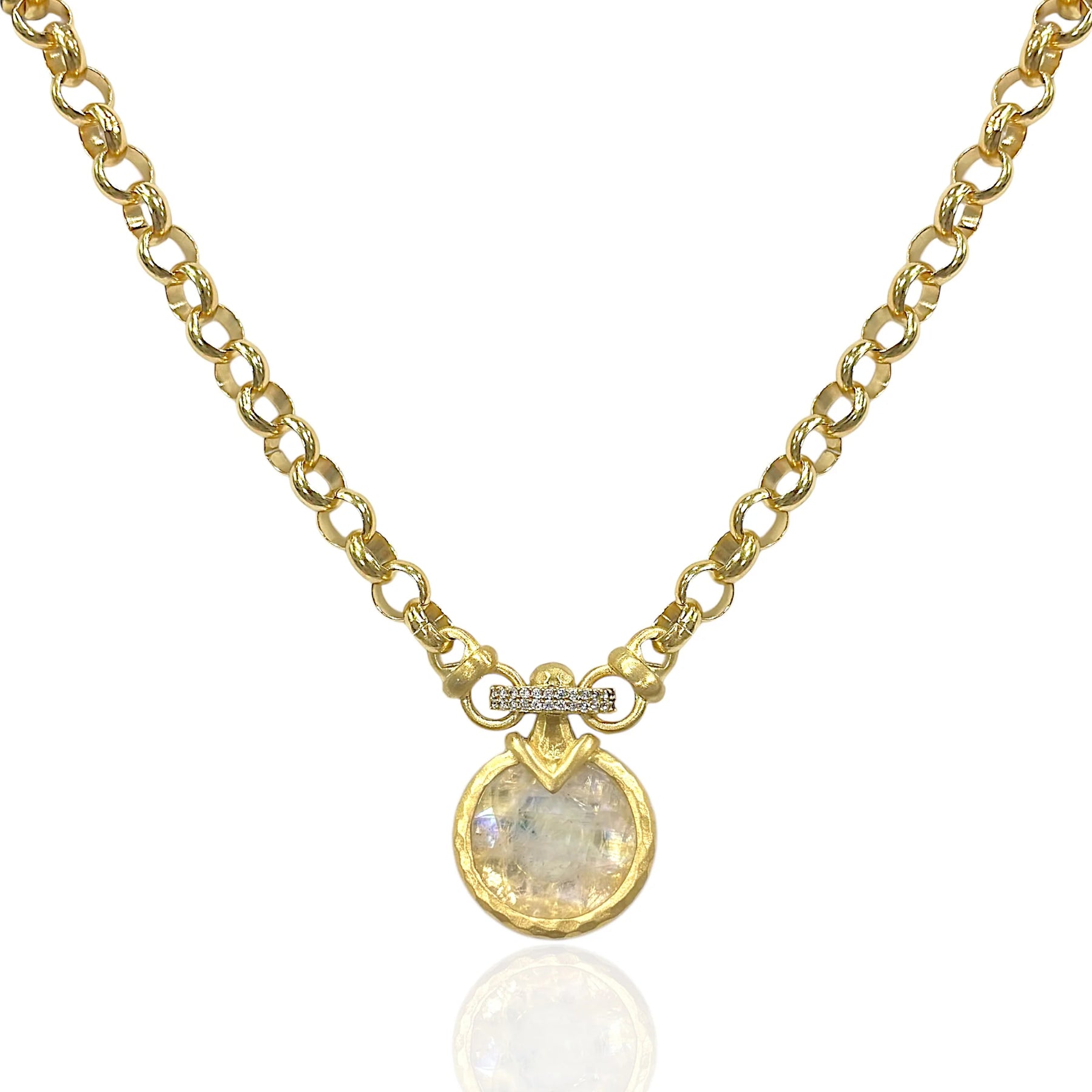 Suspended at the nexus of the chain is the luminous heart: a custom-cut Rainbow Moonstone. Set in a heavy, textured gold bezel, the stone possesses a profound inner glow. Its polished surface is the portal to adularescence—the dazzling optical effect that causes it to flash with iridescent blues, whites, and soft rainbows as it moves. The stone appears like a miniature, captured full moon, radiating a calm, celestial light.