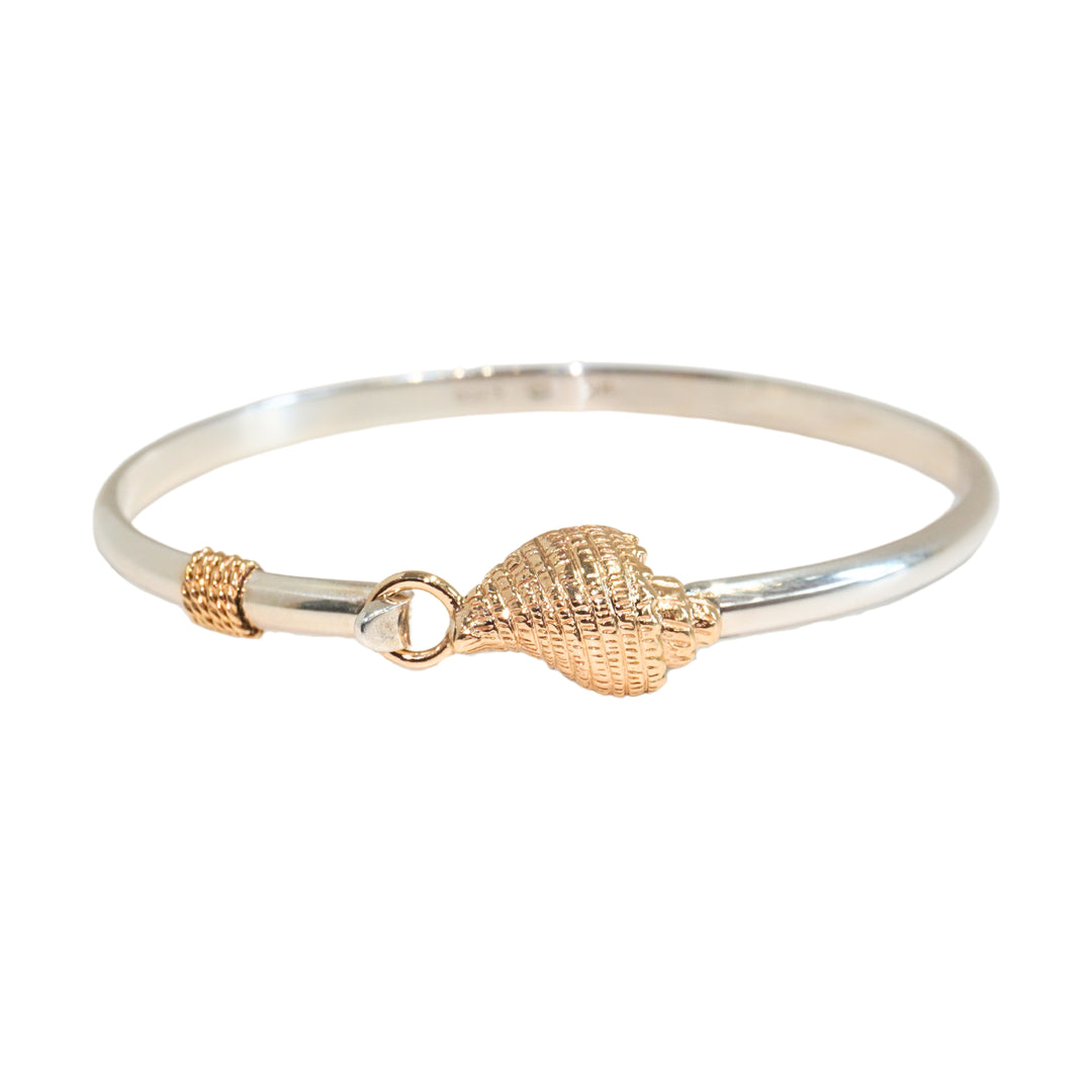This exquisite Conch Shell Bracelet offers a luxurious and secure take on the classic bangle, capturing the spiral elegance of the sea. The body of the bangle is a highly polished, continuous arc of bright sterling silver, creating a smooth, luminous foundation. The centerpiece is a detailed solid 14K yellow gold conch shell, which sits proudly at the top of the wrist, its textured whorls gleaming warmly. The piece is secured with a functional topside hook and eye clasp, which is beautifully accented with 14K gold rope wraps near the closure.