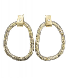 These striking Dusted Carabiner Earrings redefine organic luxury, transforming an industrial form into a statement of handcrafted elegance. The substantial, irregular oval drops are forged from Oxidized Argentium silver, then lavishly enveloped in a textured coating of 22k yellow gold dust, giving them an ancient, tactile patina. Suspended from this rugged drop is a sleek, vertical bar post crafted from smooth 18k recycled gold. This post is accented with a single, brilliant VS quality diamond totaling 0.03 carats, which provides a concentrated flash of light against the warmth of the metal. At a compelling 28.5 mm length, these earrings perfectly balance a raw, textural aesthetic with precious materials, capturing the essence of unearthed treasure.