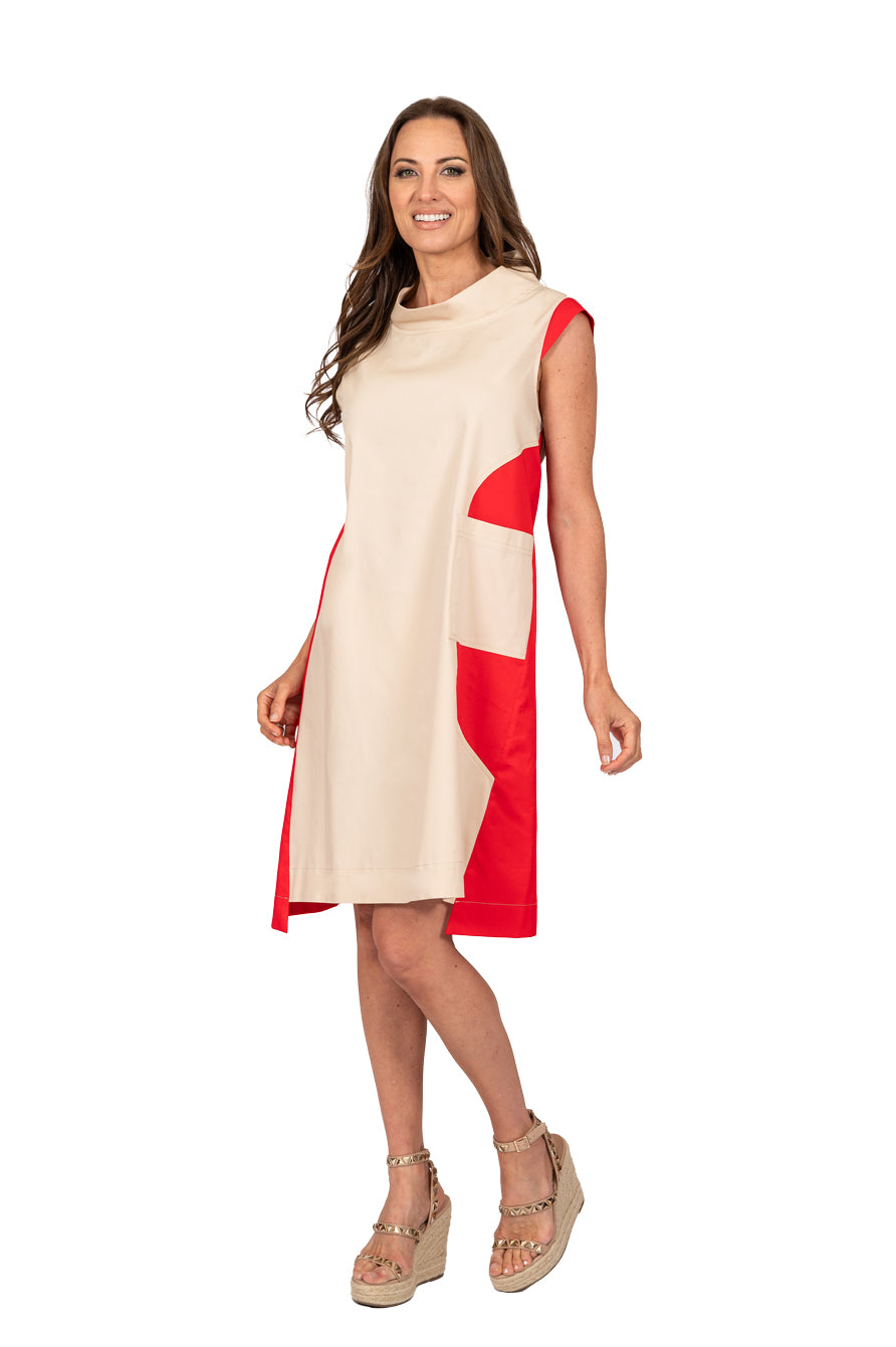Delightful lightweight cotton blend fabric capped sleeve, mock collar, knee length shift dress with two-tone detail of light khaki and red.
