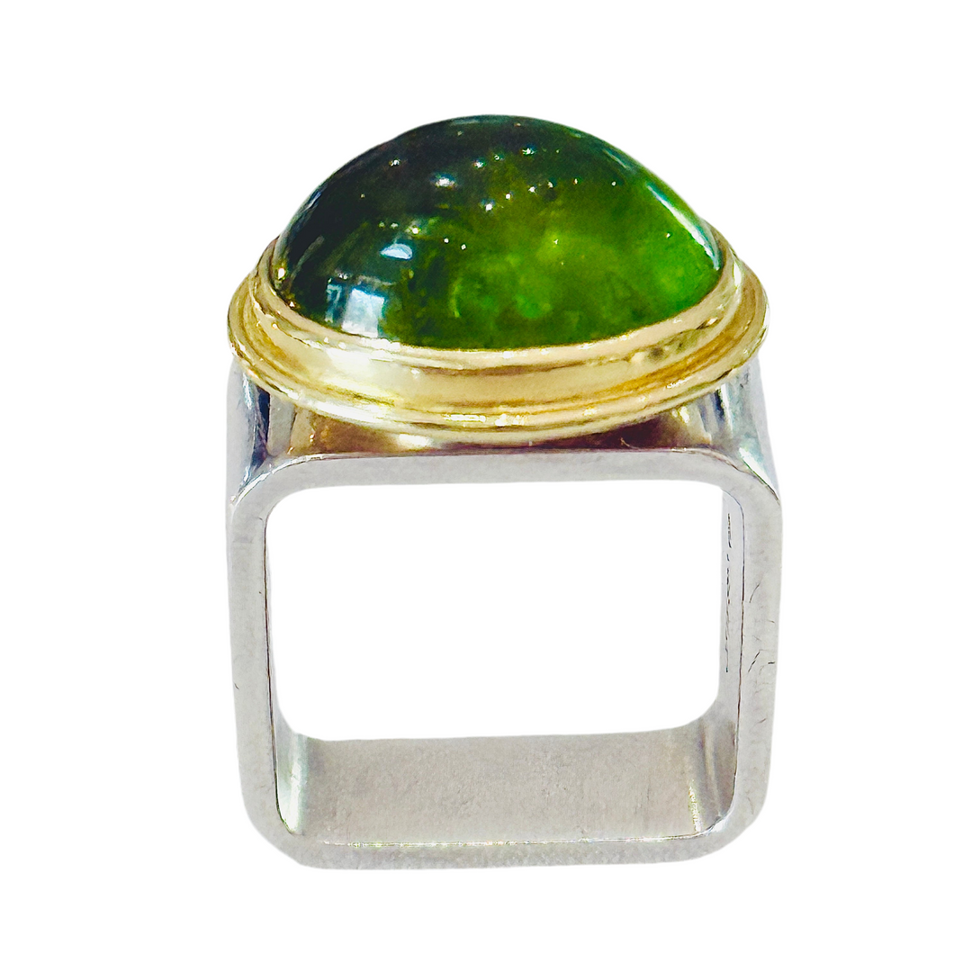 This ring captures the exhilarating energy of a sun-drenched garden with its vibrant design. Crowning the piece is a rich and luminous oval Peridot cabochon, whose intense, verdant green seems to glow from within. The dazzling peridot is embraced by a hand-formed 18k yellow gold bezel, creating a stunning visual contrast. This beautiful stone rests upon a strong, contemporary sterling silver square band that tapers for a comfortable fit. The design is a sophisticated balance of cool silver, warm gold, and the pure, lively color of peridot.